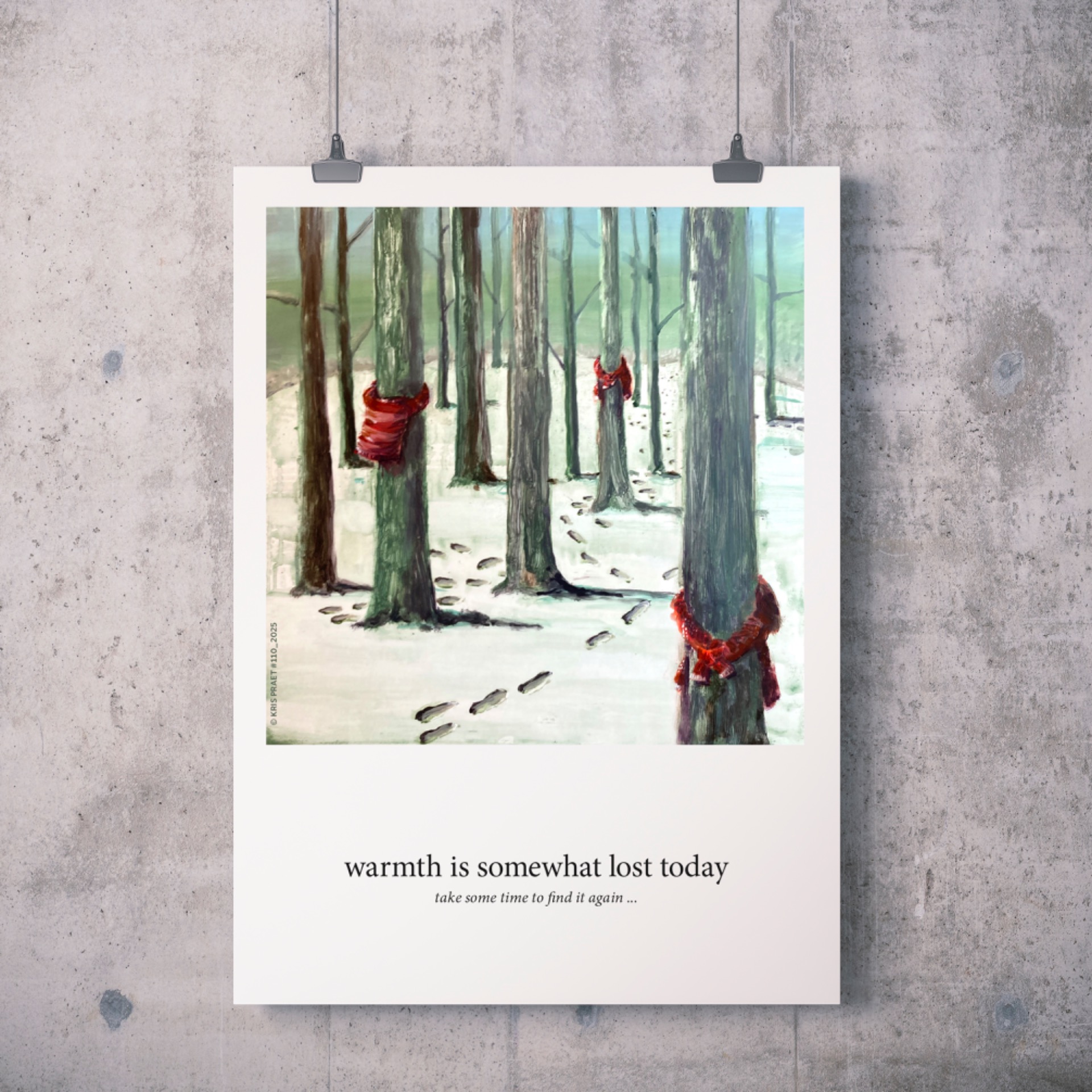 Ik wandelde door mijn straat. Iemand had zijn trui verloren. Een passant had hem rond een boom gebonden, in de hoop dat de eigenaar hem terugvond. Ik zag het als een warme metafoor voor de kilte die momenteel over de aarde waart.